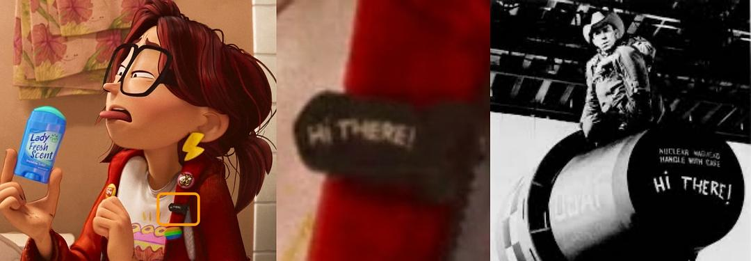 Katie的电影发烧友人设不只体现在海报,更少不了其穿着佩戴上的小心思。首先,Katie的连帽衫上别有一些胸针,除了Katie录取的电影学校,巴哥头和LGBTQ彩虹外,还有一颗核弹形状的胸针上有Hi there字样,出自于库布里克《奇爱博士》中核弹头上的文字。