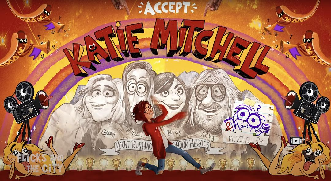 首先我们在Katie电影学院申请的视频中看到一张称作Mount Rushmore of director heroes的画面(翻译:英雄导演的雕像山),模仿美国拉什莫尔山(Mount Rushmore)的总统雕像,刻有Katie崇拜的四位导演。