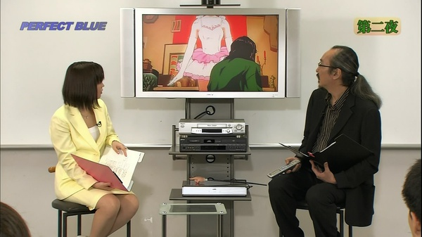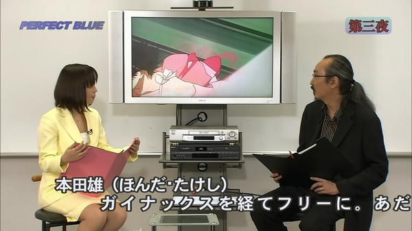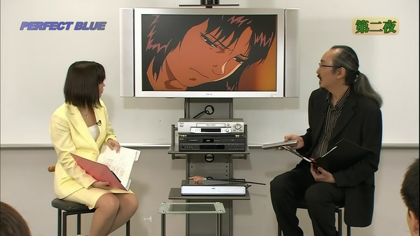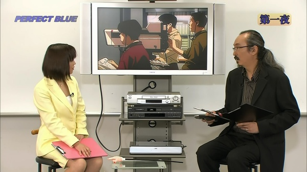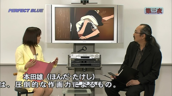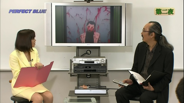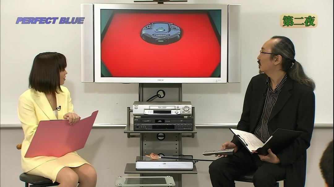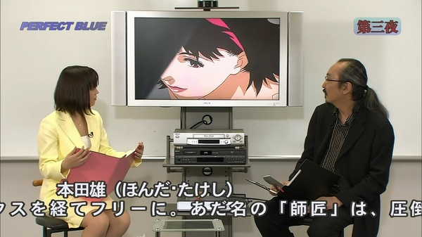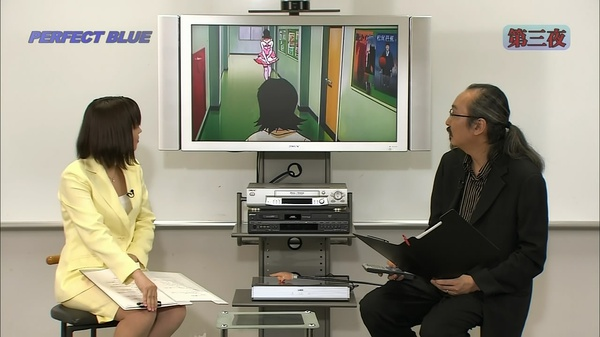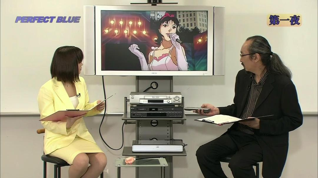 n 这个窗户今敏设计成4:3的比例,也就是以前老电视机的比例。窗户也像是电视屏幕一样,人在其中被观看着。n 另外今敏提到,这部的剪辑方式有参考《五号屠场》,利用动作顺势转场(匹配剪辑或叫顶针镜头)。n 下面是未麻参演的第一部剧,double bind(这个名字起得也很厉害啊,双重缠绕,正好符合未麻的处境)。今敏特意去拍摄现场观察,在拍摄中工作人员的状态。