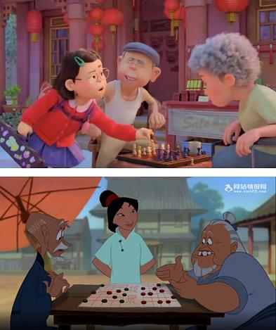 Meimei回祠堂帮老爷爷老奶奶下棋的这个片段一下子让我想起来《花木兰》里木兰去见媒婆路上(感谢评论区指正,不是去军营哈哈)帮两位老爷爷下棋的片段了。