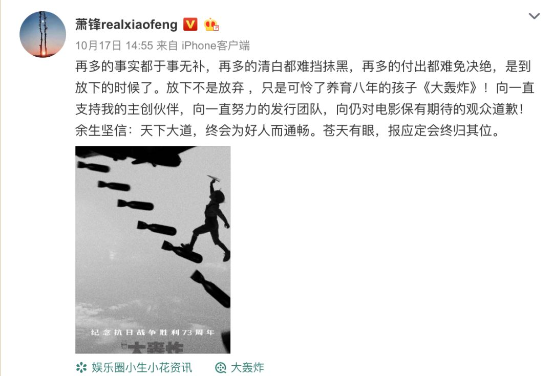 一而再再而三改档的《大轰炸》,也最终定于10月26日上映,可就在10月17日,导演萧锋又发了一篇微博,说到: