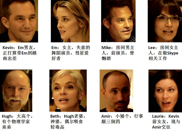 为了叙述方便,可将Em简称E(女主),Kevin简称K(女主男友,可称为男主),Mike简称M(像陈百祥,可称百祥哥),Lee简称L(眼镜妹),Hugh简称H(高个),Beth简称B(神婆),Amir简称A(矮个),Laurie简称La(绿茶婊,可称为绿茶),后面不再赘述。