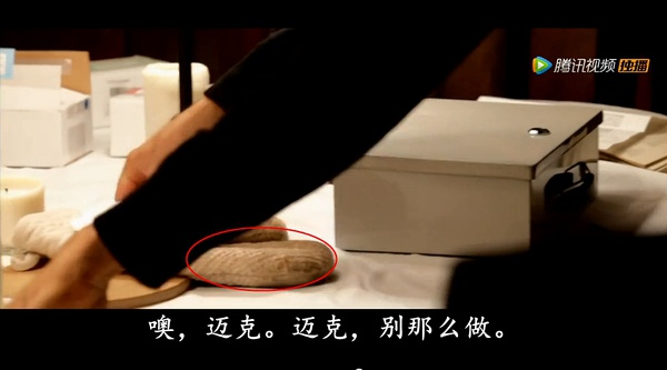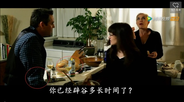 画面又一转,M(百祥哥)没切面包,实际上是在远离窗处拄着手,面包在靠近窗处完好无损,菜板边有个罐子