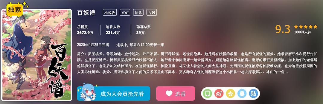 一是有些时候感觉看得很尬,国漫是否能好好缓和这种尬感,有待改善,二是百妖谱,原著第一部有十篇(再说百妖谱、百妖谱,这个“百”字没很好的体现出来),动画标明集数12集??刚好就6个???那原著剩下的4个:应声,化蛇,媪姬,照海。是没经费还是什么???