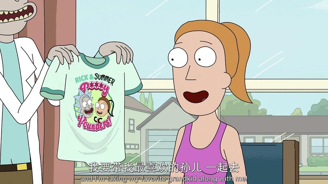 衣服经过Rick的改造,加了Summer的马尾和双峰。Summer这里演得很高兴,后来这件衣服她根本没穿过,怀疑出门就扔了。