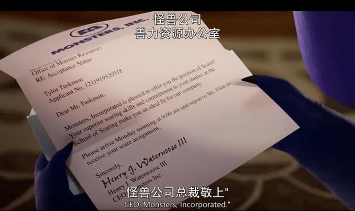 Monsters, Incorporated, 在信中的简写为 Monsters, INC。在国外公司工作,或者关心美股的朋友,一定也见过很多类似的简写,如 Apple Inc, Google LLC,以及 Ltd 等等。简单来说,Inc 就是股份有限公司,LLC 和 Ltd 都可以是有限责任公司。其详细区别,对商业知识感兴趣的小伙伴可以自行搜索了解。n