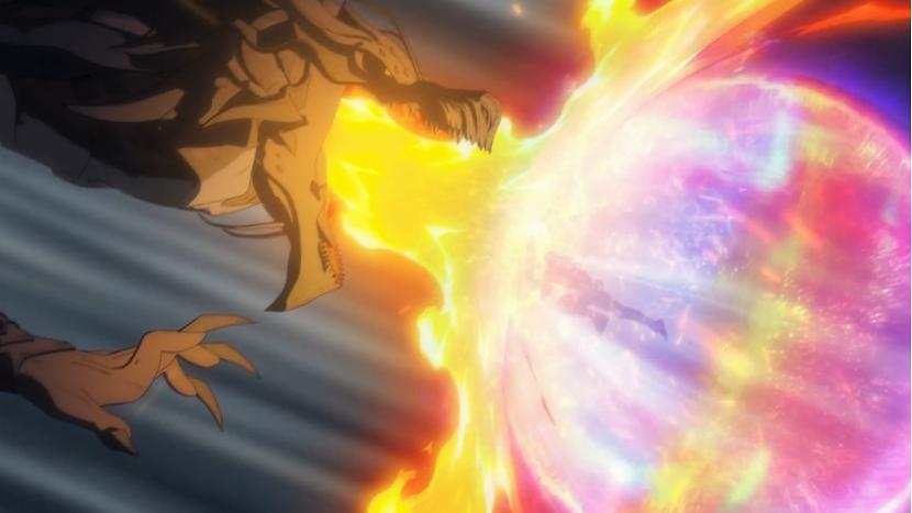 动画开头便是祈求者大战水之巨龙,卡尔先后用代表电磁力的紫球和火元素的黄球去封印巨龙。封印完成后形容枯槁,或许是因为永生之书需要法力维持,战斗中消耗过大导致没有足够的法力保持年轻。