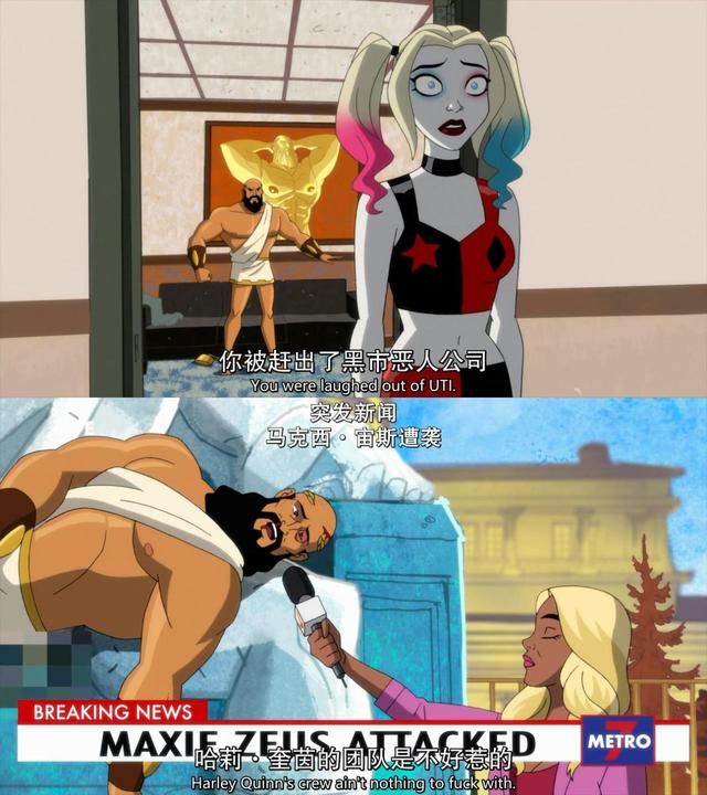 而哈莉遇到的另一位反派马克西·宙斯就比较恶臭了,哈莉本想向这位犯罪学大师请教如何招募团队,结果这位暴露癖"大师"上来就裸露下体,被拒绝后还恼羞成怒的要在恶人界封杀哈莉,并且说"没有坏人会给女人工作。"