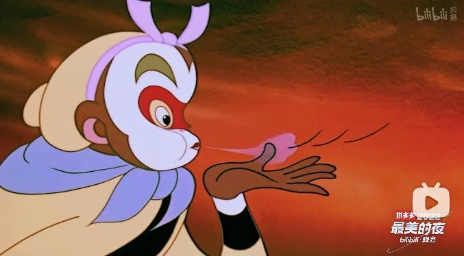 《中国人不蹦洋迪》本来就是B站今年的爆款,播放量能排到全站前十的那种,移植到跨晚舞台上也做了很多充满巧思的设计,比如国潮风十足的传统中国乐器组是大圣的三根毫毛变的。