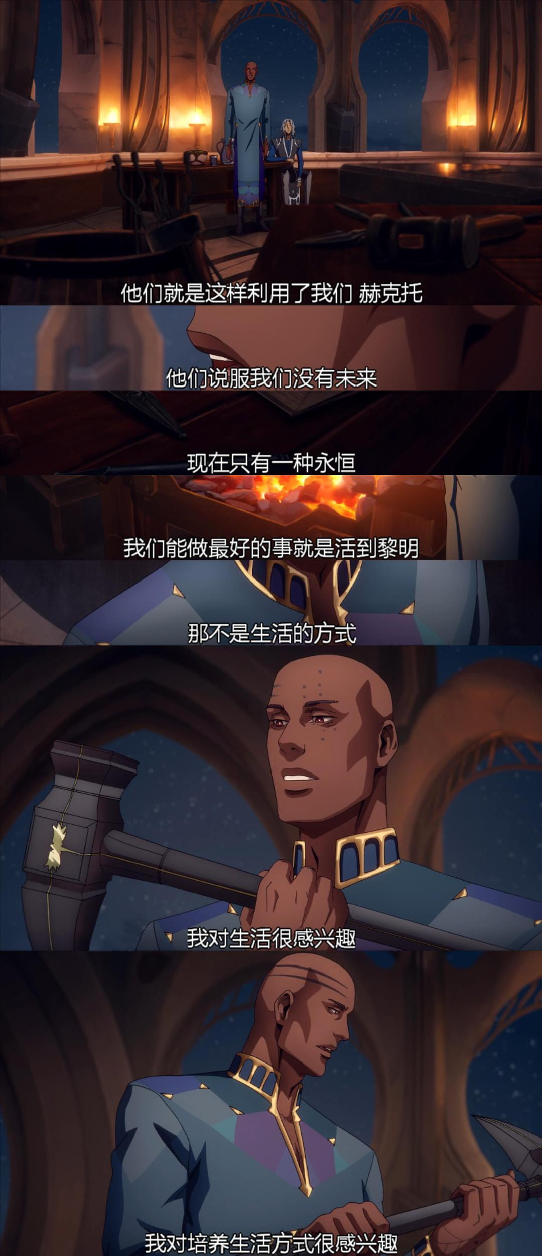 Hector似乎特别欣然地接受了自己,接受了现状,他放弃了在自己身上的挣扎,他只想弥补他的过错。这反而让Hector成长了,他不再是那个认不清自己,认不清现实的单纯锻造师了,他现在认清了自己——自己就是一个本质善良的单纯锻造师。他也不再纠结于为什么Dracula要欺骗他,为什么自己会沦落至此,这些都不重要了。重要的是如何弥补自己的背叛,这是第一次Hector自发地想要去做什么,而不是别人告诉他应该做什么。那答案自然就是复活Dracula了。其实Dracula复不复活对Hector来说并不重要,他只是觉得这是他应该完成的事情。不知不觉间Hector第一次凭自己的自由意志做出了选择,他向告别过去迈出了一步。