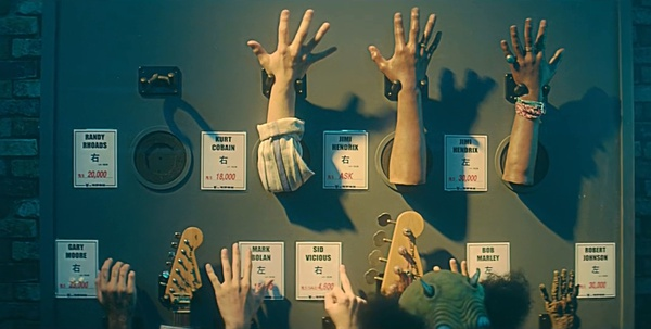 刚下地狱时少主的歌中提到,他的右手是Jimi Hendrix的左手,他的左手是Kurt Cobain的右手,下半身是MJ的下半身,声音属于忌野清志郎。