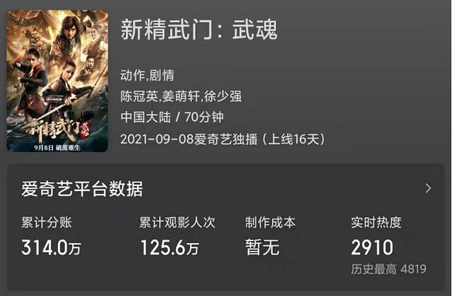 前几天,国产功夫片《新精武门:武魂》打着“致敬”的幌子,硬生生地拍成了缝合怪,《功夫》《新精武门1991》《龙虎门》等电影中的经典桥段在这部网大里随处可见,主演陈冠英吊儿郎当却又一张扑克脸的尴尬演技,更是难以支撑起主角的位置。电影上映半个月,分账只有314万,在众多网大中都算是比较差的成绩。