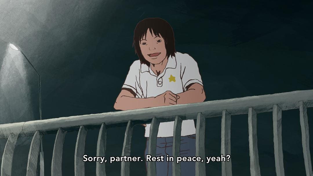 这是一个十分典型的,校园小霸王、青春期中二病的成长范例,《声之形》的男主也有点像这一卦,而《乒乓》只用几分钟的戏份,就在一个配角身上完成了相似的角色塑造。