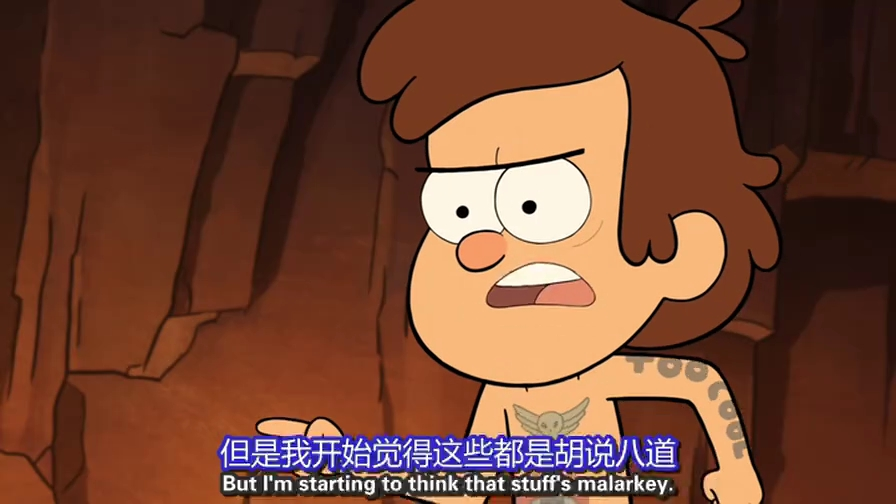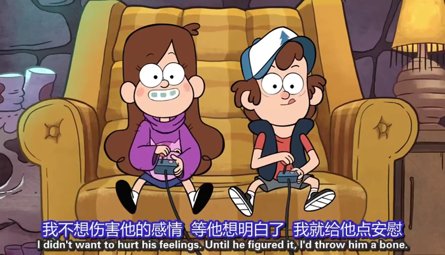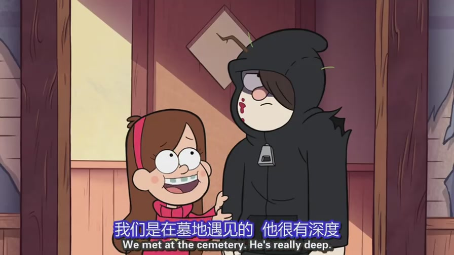 S01E14nn 梅宝决定把某些东西装进箱子,扔在所有人都找不到的地方,一个无底洞。迪普,苏斯,斯坦叔公他们却认为,没有任何一个洞是无底的,它总会通向某些地方。当梅宝把这个箱子扔进这个洞中,突然产生一个不可抗拒的力量,将梅宝,迪普,斯坦叔公,苏斯一同跌入洞中。在垂直下落的过程中,他们发现这个奇异的空间,就像宇航员在太空中,它是失重的,并且目之所及除了他们四个人其余都是黑暗的。于是他们提议每个人讲个故事,来打发无聊的时间。当他们四个人讲完故事,他们和箱子一同从洞中飞出来回到原地,此时迪普发现,从他们跌入洞中到从洞中飞出来回到原地,时间并没有流逝。nnn 四个故事 nn 一、迪普:声音终结者 nn 迪普很烦恼,因为他处于青春期的声音被梅宝,苏斯,斯坦叔嘲笑了,一个叫麦戈科特,自称制作了改变声音的药剂,给迪普喝下,第二天他的声音变得非常成熟,但是他的姐姐梅宝,苏斯,和斯坦叔公却不喜欢。在经历了一系列的事件之后,迪普决定还是用原来的声音好。nn 这个故事是典型的孩童幻想故事,对于自己那处于青春期声音的介意也完全的表现在迪普作为一个孩童的潜意识里。其中有一个细节,当(垃圾堆里的魔法师)麦戈科特给他喝下改变声音的药剂时,他对迪普说,你的声音在第二天就会改变,等迪普走后,他又说,前提是你第二天还能活着。这句话存在两种可能,一种是主观的,很显然药剂有毒,第二种是客观的,我们无法假设任何一个人不会在今天死去。第二天,当改变声音的迪普质问麦戈科特时,麦戈科特说药剂拿错了,于是他又把另一个药剂给迪普,迪普并没有喝下(迪普想到今天发生的一切,他觉得他的声音是独一无二的,是可以证明他是迪普而不是别人,即便并不是很好听),他把药剂倒在斯坦叔的杯子里,斯坦叔的声音变成女孩子的声音,显然药剂又出错了。所以,最终巫师麦戈科特说前提是你第二天还能活着产生的这两种可能并没有一个完美的解释。nn 二、苏斯:弹球最高分n 苏斯,迪普,梅宝嘲笑弹球机,恼羞成怒的弹球机将他们吸入弹球机里,并扬言要把他们摧毁。苏斯为了救迪普和梅宝,把弹球机的数据的开关按下。n 这个故事完全的可以理解为苏斯关于意义的思考,其实我个人还觉得有一种苏斯对自己人生的反讽。苏斯是弹球机最高分记录的保持者(同过作弊)成为苏斯人生的最大的意义,他上一个获得如此大成就感的事是他按下CD机,CD机弹出一块披萨。在故事的结尾,在朋友面临死亡与自己人生的意义将被清除的两难抉择中,他以一种取巧的方式化解——在他救下梅宝和迪普他说这成了他的新的意义。n 在上帝死了之后,偶像相继倒塌,宗教皇权步入黄昏,现代社会的工业化迅猛发展,机器倾轧一切,人的行为,语言,被解构,传统的对人生意义的解释不复存在。在现代人看来,意义是被赋予的,是被动的,是行为的工具或者说幌子,甚至于只是自我欺骗。nn 三、斯坦叔:橄榄球赛冠军n 斯坦叔用机器人打败年轻人,获得橄榄球冠军。n 斯坦叔的故事是完全的属于成人的故事,荣誉,金钱,和美人。一个细节,年轻的橄榄球队对赢得冠军的斯坦叔说,斯坦叔给他们年轻人上了一课,故事在这里暗示了,现实生活中斯坦叔的不服老,他想要通过年轻人的肯定来安慰自己对于年老所带来的诸多不安和烦恼。其实斯坦叔的故事完全只是他的意淫,在这里故事成为他压抑着的对于荣誉,金钱,美人的向往的一个宣泄形式。nn 四、梅宝:真心话n 梅宝讨厌斯坦叔天天说谎话,她找到真话牙套给斯坦叔戴上,让斯坦叔只能讲真话,最后,为了减少不必要的冲突或者说为了斯坦叔不入狱,梅宝最终自己编织谎言来掩饰真实。n 这是一个呈闭合状态的故事。谎言——真实——谎言。对于真实的到达某一个界限之后,真实成了把利刃,它会割开现实生活的虚假外衣,这一层虚假外衣是由所有文明人在文明的社会生活中自我保护的投射凝结成的。当这一共同的投射被消除,每个人把真实的自我暴露在外,它不仅会伤己,同时也在伤人。n 另一个方面,在这个故事的结尾,梅宝把斯坦叔的真话牙套摘下来把它装进了那个箱子里,第四个故事的结尾奇妙的成为了可以讲述这个故事的诸多起因之一。nn 四个故事都讲完了,他们又重新回到洞口处,时间并没有流逝,扔进洞中的箱子也回到了洞口,随他们一同倒退到原点。nn 之外:n 关于S01E15那个举着USA旗帜的永恒的关在禁闭里的孩子,在剧集中这个孩子只是被稍稍提了下。在故事外的我们无从得知,这个关了无数个春夏秋冬的孩子是谁?他做了什么?等等。我们对他一无所知,就像我们对生活一无所知。