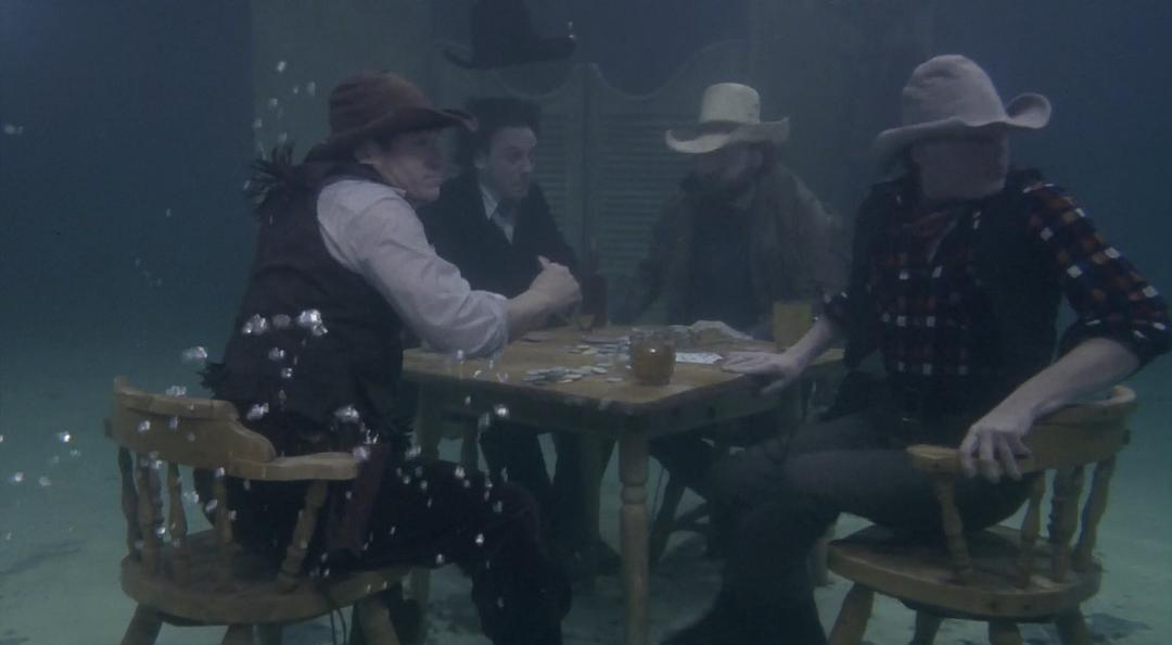 男主和反派在水下打斗,水里竟然有一座设备完善的酒吧,客人受到了惊吓,酒保还很淡定。