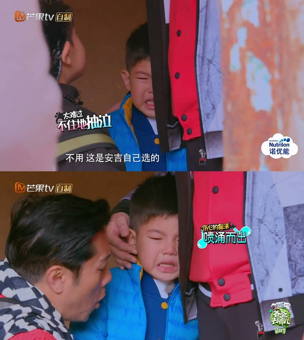 在面对不好的事实结果,更多的是被爸爸说了一路的情况下,24K纯爷们安吉终于情绪爆发特别伤心但又很克制(过于克制压抑自己的情绪不是好现象)地哭了起来,看着特别心疼。