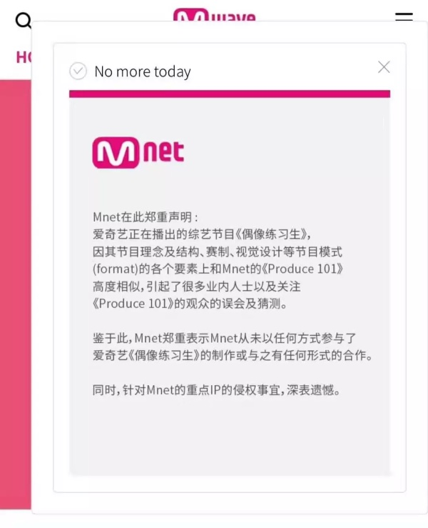 抄袭《无限挑战》的《极限挑战》,抄袭《三时三餐》的《中餐厅》,抄袭《英雄发掘团》的《神奇的孩子》,抄袭《Show Me The Money》的《中国有嘻哈》……最无法忽略的就是抄袭了《Produce 101》的《偶像练习生》。2018年戛纳电视节上,国际模式版权保护协会FRAPA点名《偶像练习生》抄袭,数据显示抄袭相似度为88分(满分100分),刷新世界纪录,成史上抄袭之最,Mnet也在官网用中文发表声明,表示“遗憾”。