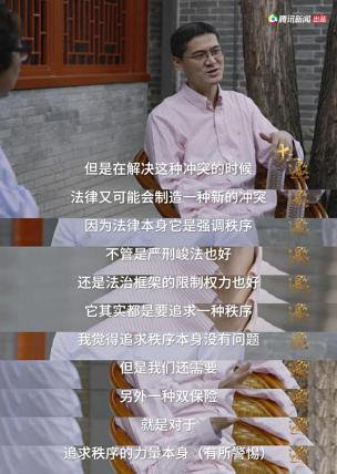 可罗翔的谦逊来自哪里?从头到尾看完这一个小时,观众应该都能发现,他的谦逊源于他作为一个法律人独有的界限感。这份界限感在节目中表现得特别明显:法律人既要用法律对正府的权力有所限制,也要对民众的激情有所限制,还要对作为限制本身的法律有所限制。而最重要的,是认识到自己作为一个人的限制,在约束别人之前,懂得先约束自己的权力、激情和理性。由此罗翔说,法律人应该是城邦的“双向牛虻”,一个永远在哪里都应该是一个不合时宜者,都应该要刺痛别人,甚至先刺痛自己来使自己警醒的人。不仅如此,还要限制自己对自己的限制而产生的个人崇高感。第二季许知远采访李诞时,说自己最为之感动的是那些壮丽的、崇高的东西,但依罗翔的看法,这份崇高感也是要自我约束的。在某种意义上说,这期节目不疾不徐、不咸不淡的节奏就是罗翔导致的,因为他是那么一个自省而温和的人,讲话的语速不快不慢,被问到一时想不出答案的问题,就嘟起嘴想一下,再慢慢跟你说,这份可爱打动了许多人。