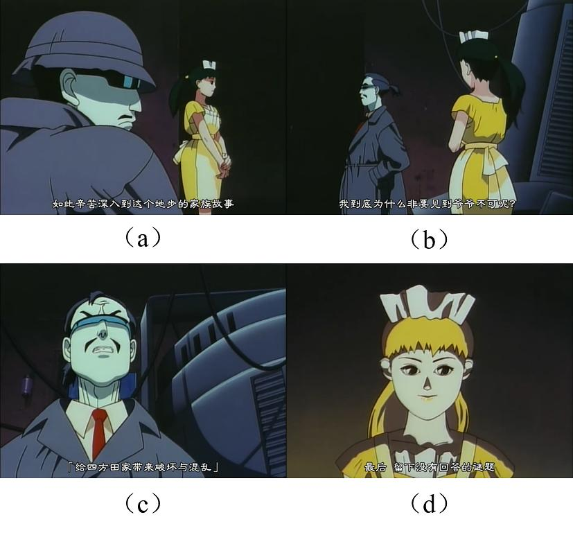 在《祖先》中,押井赋人物以“故事结构”,和人格形成剥离,而该命题在《无罪》中则以更加纯粹的人偶(shell)/人类对组所体现,图 4为展现该对组的数帧。