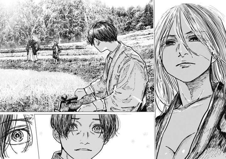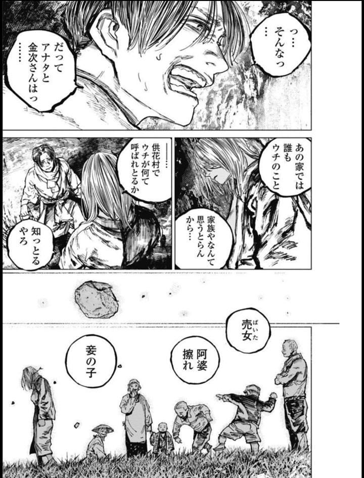 当然另一方面村民也并不是省油的灯,在后藤家有个叫银的女子(因为发色雪白而得名),她在后藤家的地位非常特殊——与其说她是后藤家的一员倒不如说是家主金次泄欲的工具(金次在家里本来也以乱伦而闻名),不但如此,金次还在每年的庆典上和村民们一起对她“咸与同欢”;家主既然如此,村中的三老和其他成员自然也是有样学样,见了银先踹一脚然后再踩脸都成了正常操作,村民们更是把她当做低贱和不洁的象征,从来就没有将她视作人类,见面就恶言相向,甚至拳打脚踢、泼脏水。而银也就在这样的环境中形成了她坚韧、残忍的性格。