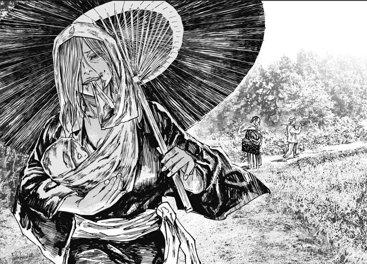 然而银大难不死,她不但自己活了下来,还把孩子生养了下来。只不过经过此事件的刺激,她已经完全被复仇的愿望所驱使,化身为修罗;以屠戮迷路的村民为生,以他们的血肉为食;某天她在袭击了两个落单的村民之后,让活着的那个人回去报信,宣告了她的回归。
