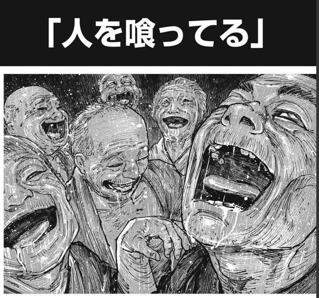 半脸男拿下面具的一刹那,被啃噬过的伤口就成为一个巨大的黑洞,牵扯出后藤家的地窖中关押的各个年龄段的贡品儿童。他们或许丧失了视力和行走能力,成为“会动的肉”;作为反面,后藤家族成员才是后藤银定义下的“真正意义上的人类”,这个“人类”不可以是“个体”,因为单独的个体会让家族陷入危难,他们只能以团体凝聚的方式构成“食人者共同体”:要么成为家族的一员,也么死亡并成为贡品。