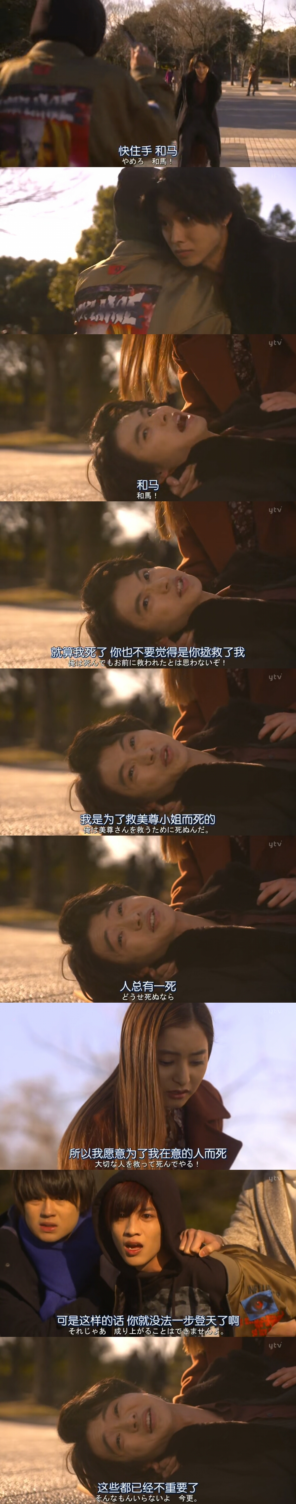 第二集给出线索,宰子是来救男主的,她发现男主被人盯上,所以用口红给他留下警示字条。既然是救命小天使,为何不能说明原由,笑着接吻,偏要拍成鬼片既视感,莫非这都是导演的安排(制造悬疑紧张感)?第二集结尾天雷滚滚,和马(志尊淳)因爱生恨,要和心爱的渣男Eight(山崎贤人)共赴黄泉,最后捅死了Eito后跑路了。神秘流浪汉营田将晖在倒地的eito身旁狂笑,看得我毛骨悚然。导演这段你想表达什么?