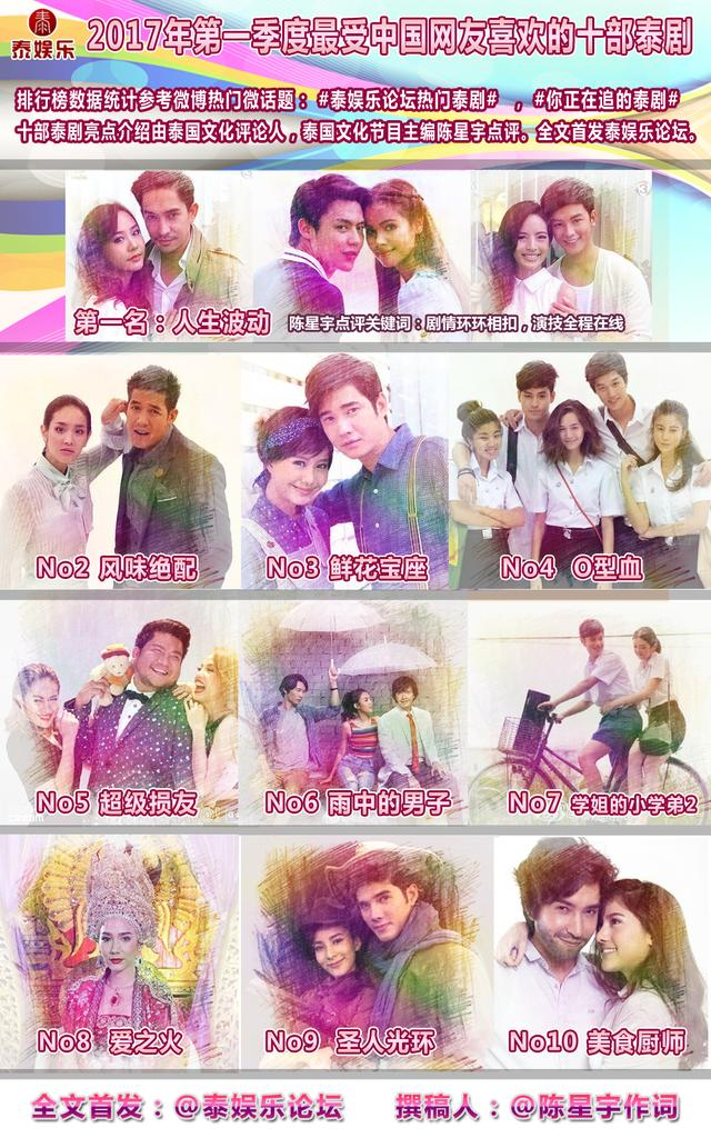 据中国泰娱乐论坛最新分享发布的 2017年第一季度中国地区最具人气的泰剧网络关注度数据排行榜,其中有十部泰剧最受中国网友追捧,这其中包括了泰国CH3台,泰国CH7台,泰国GMM,泰国workpoint等等各类频道放送的电视剧。这个《2017年第一季度最受中国网友喜爱的人气泰剧排行榜》的数据统计参考了泰娱乐论坛最热门的两个泰剧互动微话题,#泰娱乐论坛热门泰剧# 与 #你正在追的泰剧# ,以及#泰国娱乐新闻摘要#中关于泰剧资讯的相关话题,以此综合选出了在2017年1月到3月份,十部最受中国网友喜欢并且积极参与互动讨论的泰国电视剧。陈星宇我借此机会,针对这份泰娱乐论坛发布的排行榜,对这十部泰剧进行一个简单的亮点介绍,旨当做一个给喜欢泰国文化朋友们的观剧推荐。抛砖引玉,如大家有不同想法,也欢迎可以与我一起交流分享。另外关于这个榜单,据了解,因为所参考的数据是来自于中国微博网络平台,所以,这热门泰剧的排名与泰国本土观众所追捧的电视剧方面或许会有不同,而且这些泰剧能够被中国网友追捧,也得益于许多大大小小的字幕组倾情奉献译制,让广大中国网友能够与泰国观众一起同步欣赏到剧目,字幕组译制出来了的泰剧才能够被大家看到,才能够被大家喜欢,所以这个因素也导致这一份排行榜与泰国本土的人气排行会略有不同,仅供参考。