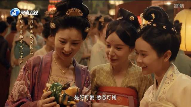 唐夫人一行人逛洛邑古城时,在街头展示了非物质文化遗产:皮雕、白马寺金银器制作技艺、宋氏面塑、三彩釉画烧制技艺。