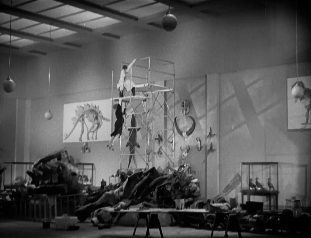 霍克斯是研究步伐的专家。但是当然不只是人们的步伐。有时候我想猎豹和小狗乔治也有他们自己的“步伐”。但是更为吸引我的还有它们的声音。完全的,随时可能进入“合奏”的声音。这就是为什么 Katharine 抱着乔治唱歌的时候这么动人。这个歌声令我们安静了下来。是的,就像这个歌声令猎豹安静了下来一样,一些奇怪的相似之处:我们(目光)被驯服了。同时我还能提到的(我认为每个人都会意识到),结尾两人摇晃着身躯互相示爱的正反打镜头,多么的简单,完全是爱意的上空,Katharine 借由恐龙的骨架跳到了 Cary 的孤独堡垒,那里从来没有人能够上来。在摇晃,在瞬间的激情中纵身一跃——唉可不是那种最庸俗的 “you jump!I jump!” 的戏码,而是一个战胜某些庸俗不堪的秩序的态度。我们不得不承认那具恐龙骨架实际承担这样的意义。多亏了乔治!让这幅秩序的骨架永远无法形成;因为就好像,Cary 真的很想婚后去度蜜月一样。在此之前,我们从未看到 Cary 做出如此欢快的举动,摇摆、晃动,玩着独属于 Katharine 和他自己的肢体游戏:危险的游戏,Katharine 差一点掉下去!可是 Cary 总能抓住她,哪怕身前的庞然大物(恐龙骨架)轰然倒塌,Cary 喊道:“那是我最愉快的一天!”,要有疯狂的、好笑的爱情,银幕内外,这就是霍克斯的态度。