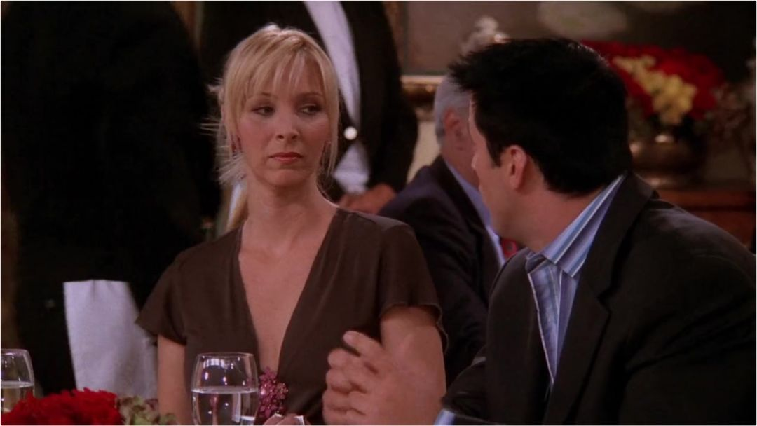 菲比的按摩顾客给了她三张去“摩根大通博物馆(Morgan Chase Museum)”看展览的机会,这是摩根大通公司捐资兴建的工艺品博物馆。Jim Belushi,Matt Lauer,Harrison Ford,Air Force Once乔伊要把自己的照片放到一家干洗店的名人照片墙上,这些照片的主人翁都曾到这里来干洗衣服。乔伊说,他的照片曾经被挂在吉姆·贝鲁西(Jim Belushi)的旁边,这是一个著名演员,曾经演过《大人物乔》和《红场特警》等电影。在一边帮忙的菲比就说,这回你可以挂到马特·劳尔(Matt Lauer)旁边,这是NBC《今天》节目的一个主持人,菲比很喜欢这个帅哥,居然问干洗店老板索要他在这里洗的衣服。干洗店老板在看了乔伊的节目录像带之后仍然不让他的照片上墙,因为他觉得乔伊的电视剧侮辱了他的祖国俄罗斯,里面的俄罗斯人全是恐怖分子。乔伊争辩说,你的墙上也有哈里森,福特(Harrison Ford),他的《空军一号(Air Force One)》里也全都是俄罗斯恐怖分子。但干洗店老板说,哈里森是一个很好的顾客,因为他经常带衣服来洗,而你却什么也没有带来。