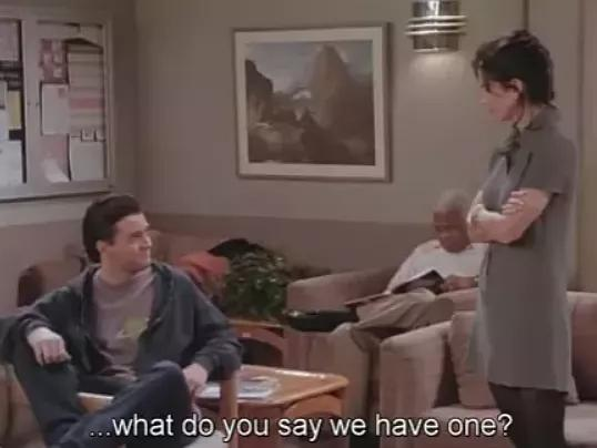 瑞秋听说钱德勒要搬过来和莫尼卡同住,还以为他们要三个人一起住了。她就开始唱:“来,敲我的门……”不想让瑞秋失望的莫尼卡紧接着唱:“我们等着你……”这是电视剧集《三人行(Three's Company)》里面的主题曲,这本剧集就是讲述两个女子和一个男子生活在一套公寓里的故事。