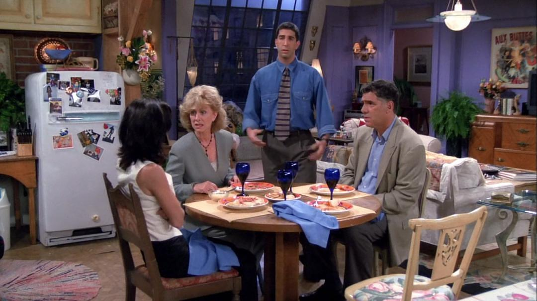 乔伊挣钱了,给公寓买了两个沙发和一个新电视,钱德勒说,这下可真的可以好好看看《绿色田野(Green Acres)》了。这是美国六十年代著名的电视剧,剧中有很多令人心旷神怡的农村风光。Dick Van Dyke,Rose Marie罗斯在夸奖乔伊的新电视屏幕很大,说看起来迪克·范戴克和真人大小一样。范戴克是美国著名的老演员,身材不高。莫尼卡则说看来《罗斯·玛丽》只适合在小屏幕上放,这是美国早期的一本电影。Sorentino's罗斯和瑞秋准备去吃饭,但罗斯博物馆的事情忙死了。等他忙完时,瑞秋说:“索伦蒂诺(Sorentino's)也关门了。”这是一家著名的意大利餐厅。