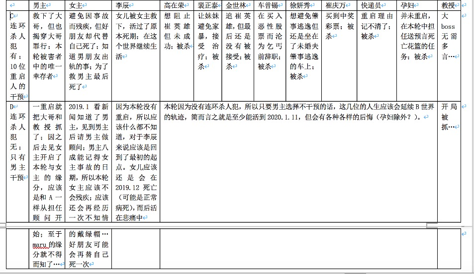 因为剧中展现的不同重启中的人物命运比较复杂,所以做了一个整理表格一下。具体内容仅凭记忆,没有回对原剧内容,所以可能存在偏差。