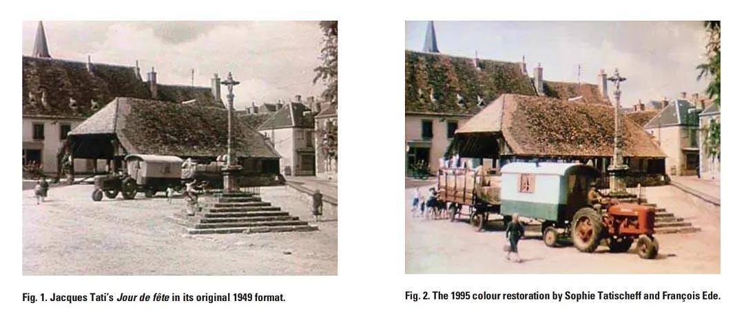 《节日》有一个很重要的情节,塔蒂扮演的弗朗索瓦透过大棚的缝隙偷看了一场免费电影,一部表现美国邮政高效率办公的科教片,里面起着摩托甚至开着飞机送信的美国人,彻底让这位法国乡村邮递员傻了眼。银幕之外的塔蒂同样被电影的新技术困扰着,奥莱恩当时在法国技术委员会任职,他急于把《节日》拍成法国第一部彩色电影,并且运用本土研发的Thomson color(当时通用的是柯达开发的Technicolor)。塔蒂对这一国产彩色系统心存疑虑,所以就坚持同时使用黑白摄影机和彩色摄影机。这个决定虽然让工作量增加了一倍,每场戏都得重拍一次,但事后证明是正确的选择,因为影片的彩色胶片还未洗印,Thomson color公司就破产了。《节日》最终上映的还是作为备用的黑白版本,奥莱恩的爱国革新举动也落了空。其实,塔蒂对电影的色彩有自己的一套理论,比如他把《游戏时间》描绘成一部“彩色胶片拍出的黑白电影”。和卓别林一样,后来出了大名的塔蒂也喜欢反复调整自己的旧作,用他的话说就是“修改家庭作业”。筹备《游戏时间》的间隙,塔蒂在1961年还为《节日》制作过一个手工上色的版本,国旗、气球等道具都填上了装饰性很强的颜色,并重新制作了音轨。当年未能采用的彩色胶片也保存下来,1995年在塔蒂的女儿索菲·塔蒂斯切夫(Sophie Tatischeff)的主持下进行了修复,“法国第一部彩色电影”在迟到近半个世纪后终于上映。