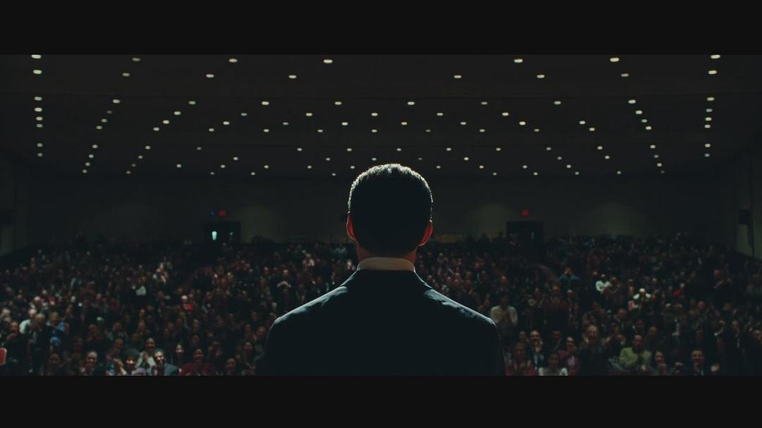 影片一开始的镜头一直没有给到他的正脸,我们可以看到他的下巴、一丝不苟的发型,而是随着他的背影在前进,其间光暗交错的明暗变化是不少传记影片的特点,也是往往体现主人公所莫测的命运,伴随着背景中对他功绩的介绍,镜头来到了主席台上,来到了灯光下,将他展现在家长、老师的目光之下,就是一名社区的英雄、伟人、偶像,这时候镜头转到了他的正面。