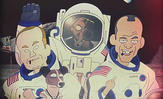 2001太空漫游的导演库布里克瞬间抵达了下一个yin谋论画面——由他执导伪造了美国登月,三位宇航员对应了当年的三位真人,宇航服头盔反射的就是当年的库布里克和他的摄像机。