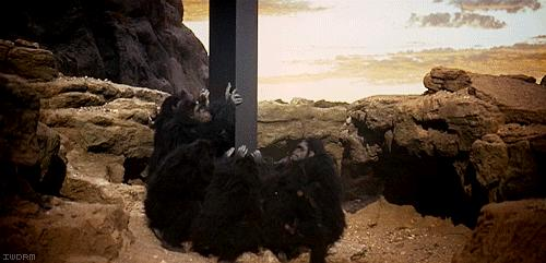 地心蘑菇Myc的画面,背景环境和黑色猩猩,致敬了2001太空漫游的“名场面”
