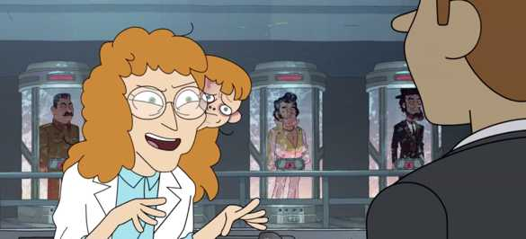 以第九集为例,Reagan穿了乔布斯经典的高领黑毛衣,然后接任公司时介绍愿景时对推特、麦当当、林肯、google(not evil)、医疗计划等进行了简明扼要的嘲讽。更好笑的在月球那一集,最后还要严明“登月是真的!”哈哈哈还是很感谢网飞能投资这么好玩的动画。