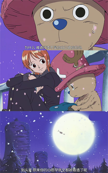 海贼迷看到这一段剧情,很难不想到乔巴加入草帽海贼团的那一段催泪剧情。当乔巴和朵丽儿医生说自己要离开磁鼓王国,与路飞他们一起出海冒险时,医生把它大骂了一顿,说它这么胆小在外面的世界肯定会遇到很多挫折,无法照顾好自己的,但乔巴还是在月圆之夜和路飞他们一起勇敢地驾着雪橇离开出海了。到了船上,乔巴才发现朵丽儿医生已经提前替它收拾好了行囊,真正的关爱之情,一切尽在不言之中。