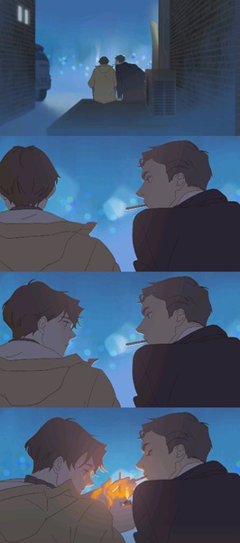 两人并排抽着烟,气氛安静而美好,回忆如期而至。