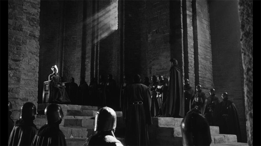 摄影方面还是威尔斯标志性的深焦摄影,光影舞动间平面的影像仿佛获得了立体感,跳动的摄影机好似有了生命通过屏幕与观众对话。为了体现莎翁剧的戏剧性威尔斯放弃了他的杀手锏长镜头,而采用多机位跳切以加深影像的冲突感。在人物对话时至少有几十个机位来回切换,普通的正反打在多视角的切换中具有了无限的可能性,人物关系与机位变化相得益彰,共同为情节服务。总之,威尔斯的机位只有你想不到的,没有他拍不到的。其中最为精彩的战争戏借用画面构图的角度与低机位特写快速剪辑将几十个人的战斗拍出了千军万马的气势,而如今的好莱坞大片用上亿的特效也不过如此。