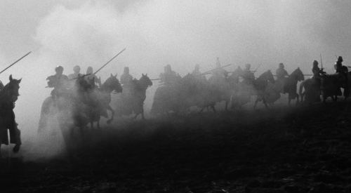 The scene of the battle of Shrewsbury is justly famous. It lasts fully 10 minutes, chaotic action at a brutal pitch, horses and men confused in smoke and fog, steel crashing against steel, cries of pain, desperate struggles, confused limbs caked in mud and blood, men falling exhausted or dead. Barbara Leaming, one of Welles' biographers, says the scene was created by careful framing; Welles at no time had more than about 100 extras, yet seems to have a multitude, and the violence of the struggle was studied by Mel Gibson before he directed "Braveheart."