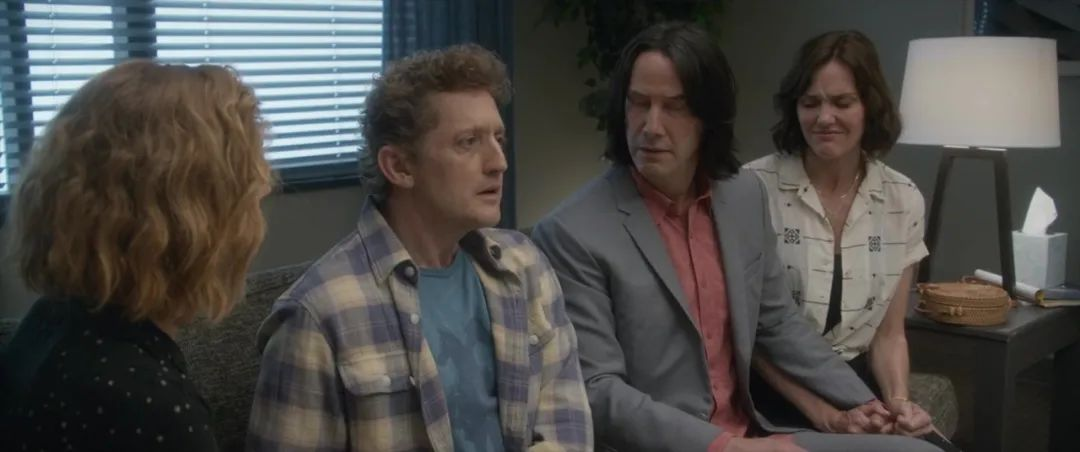 这样看来,其实没什么新意,不过是把前两部的剧情缝缝补补捏出来一个新的主线罢了,而且影片中的情怀卖得也是很开,除了基努的泰德,亚历克斯的比尔外,他们的两位老婆,泰德的父亲,风情万种的米茜,玩摇滚的死神,还有那个曾经的引路人鲁夫斯(因为十多年前就去世,所以用之前的影像回顾了一下),都一一出现,在我看来,倒是更像是在贩卖情怀。