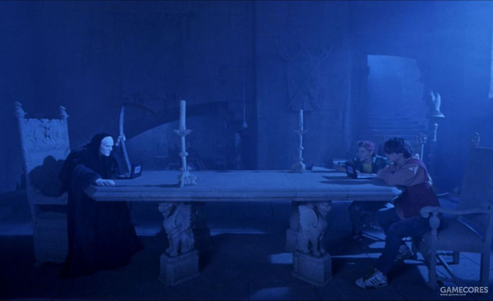 有地狱,自然就有天堂。比尔和泰德拿出那股子高中恶霸的劲头缠着死神,终于让死神答应只要能够通过地狱考验,二人就可以上天堂向上帝请求重返人间。影片在此处不怀好意地恶搞了英格玛伯格曼的名作《第七封印》,与死神下棋变成了战舰棋和扭扭乐等桌游。