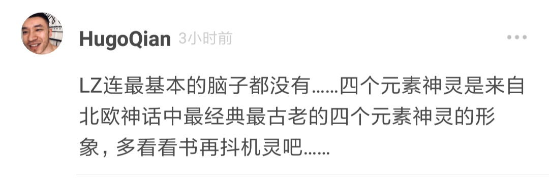 经过在讨论区的讨论,和我本人的考证,至少可以确定火元素和水元素确实有神话传说中的原型,风元素和土元素也是在北欧的民间传说故事里有关,但偏偏就不属于北欧神话和北欧诸神没有相关性。