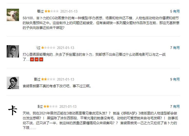 “吉卜力的CG动画意外有种手办感,人物动作超级生硬”n“打心里佩服看完,失去了手绘魔法的吉卜力,糟糕透了”n“宫崎吾朗要不真的考虑改行吧,事不过三啊”n“天呐,都2021年居然还能看到橡皮泥的头发?”