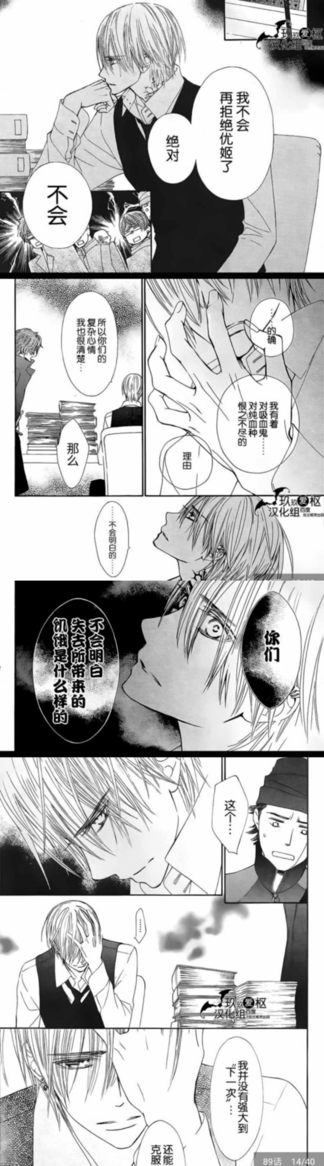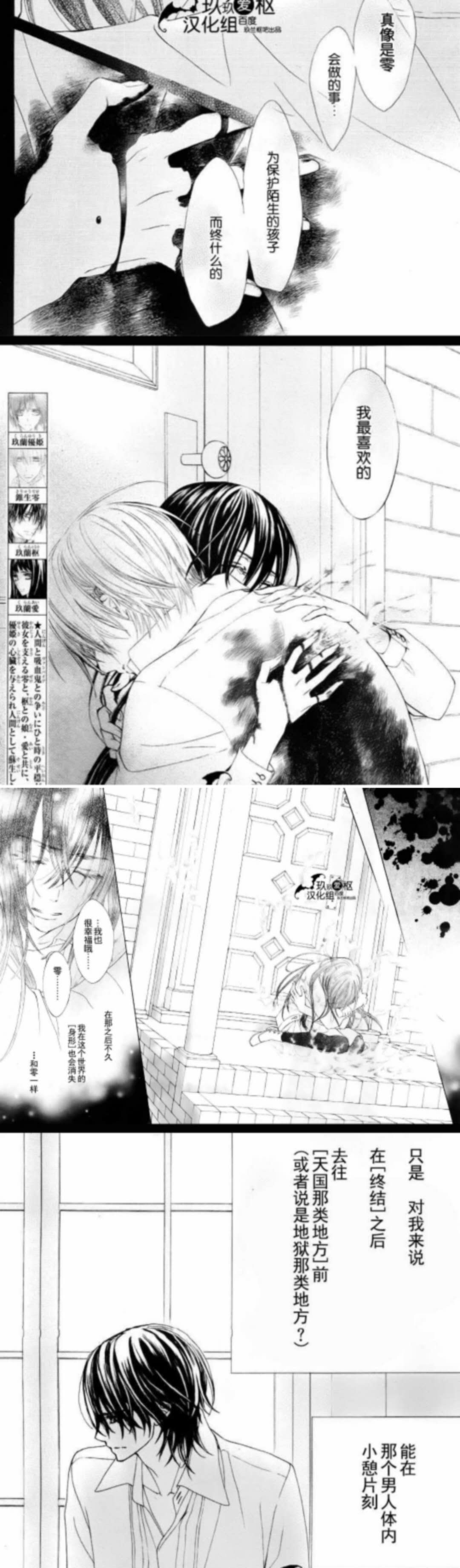 在经过一番记忆复苏的恐怖折磨后优姬还是在作者(=读者)的要求下反省了自己的任性,前脚送走零后脚就向枢拔足狂奔,最后依照惯例变成吸血鬼,新婚夜YD地主动采取上位,在一堆【烧饼】中体验到咬人时血液融合的满足感而不是只有被人咬的恐惧。