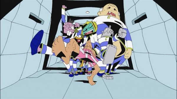如果你是个今石洋之的粉丝,那在这部动画中,你能看到不少他之后作品的一些元素雏形。比如《天元突破》里的钻头情节,今石洋之借大哥的口说出了“钻头是男人的浪漫”,然后再配合片中钻头所在的位置,怎是一个大写的污字可以概括的。另外《吊带袜天使》中,那令人感叹的X场景,以及那涂鸦式画风,在这里都已经尝试过了,也许是因为挂着实验性作品的名头,所以他才敢在这里面尝试了很多种想法,这也是为未来那些取得成功的作品埋下了伏笔。