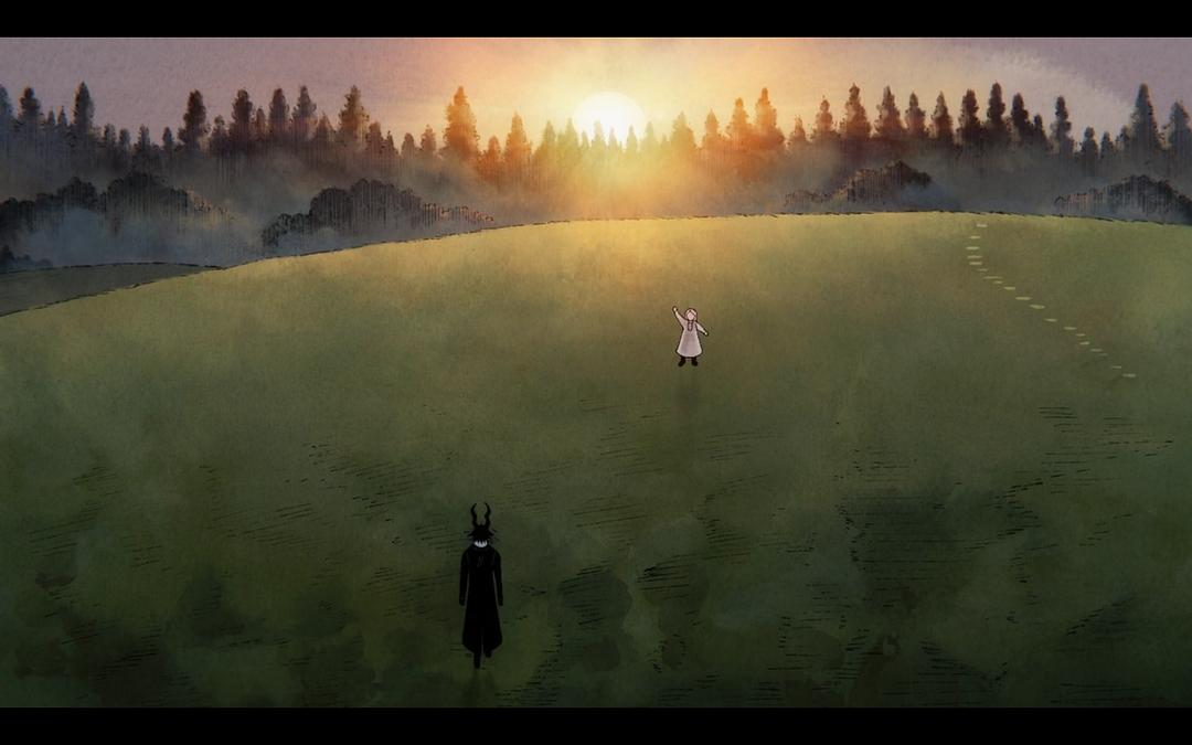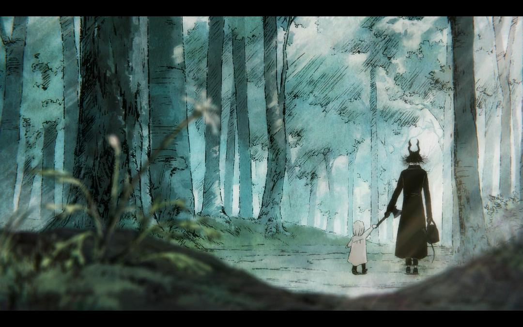 昏暗丛林,明灭火光。纯白的女孩,漆黑的怪物。不难理解《他之国的少女》为什么选择了这样一种画风。尤其是片头,一黑一白两只手,伴随着零碎的画面,颠倒、闪烁、旋转……指尖的若即若离看似近在咫尺,仿又相隔万里。